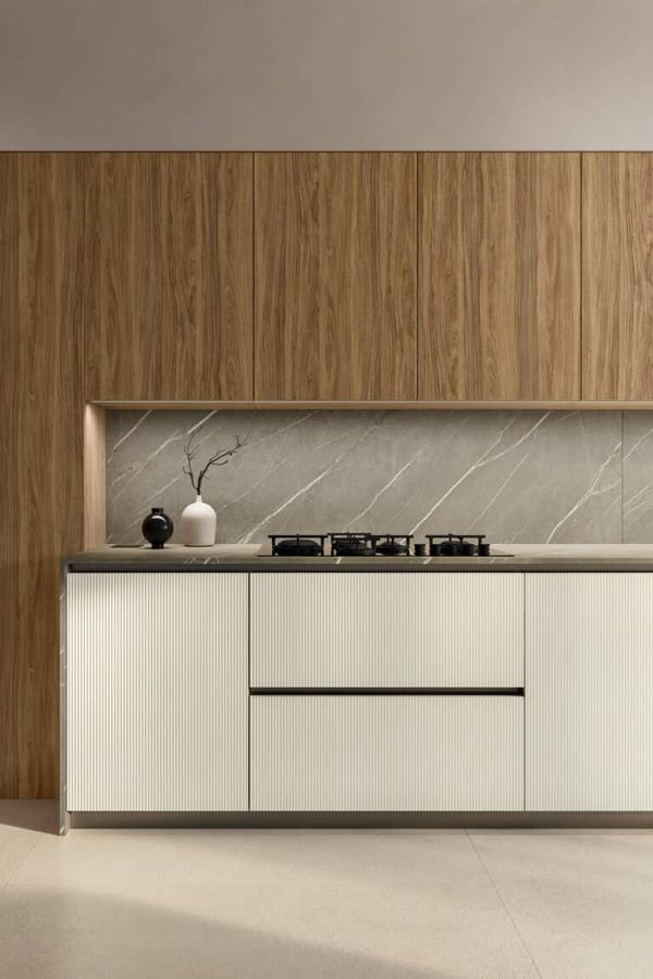 L’anta Riga è il risultato di un’articolata lavorazione dello spesso strato superficiale di legno impiallacciato, per ottenere un’anta cannettata verniciata nelle varianti colore della collezione Armony.